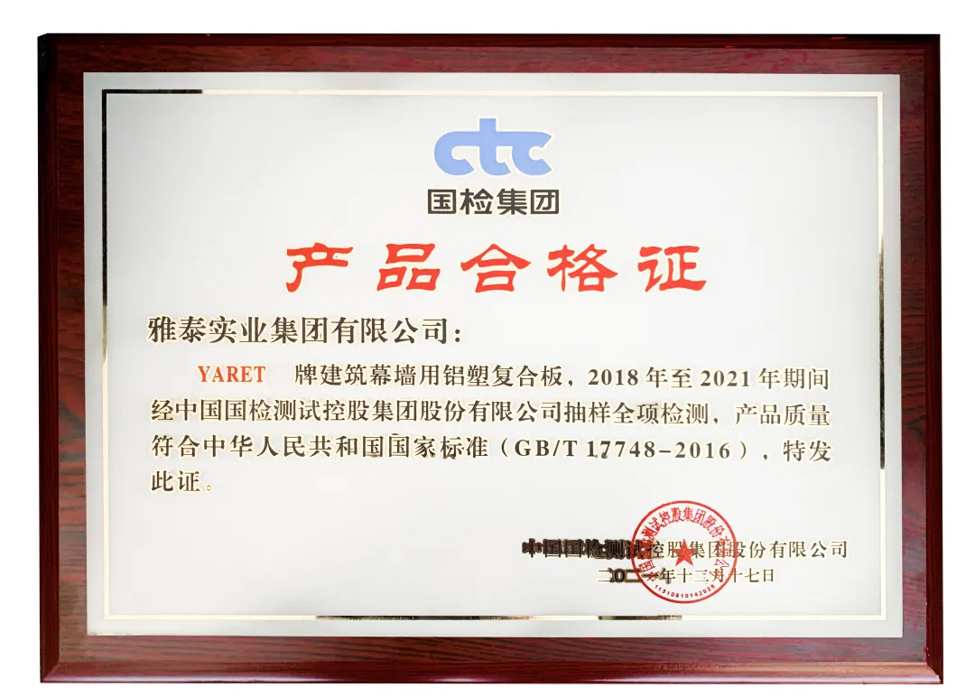 會(huì)上,對(duì)2021年度行業(yè)優(yōu)秀的產(chǎn)品與企業(yè)進(jìn)行了表彰頒獎(jiǎng)——雅泰 YARET 牌鋁塑復(fù)合板,于2018年至2021年期間經(jīng)中國(guó)建材檢驗(yàn)認(rèn)證集團(tuán)股份有限公司抽樣全項(xiàng)檢測(cè),產(chǎn)品質(zhì)量符合中華人民共和國(guó)國(guó)家標(biāo)準(zhǔn)(GB/T 17748-2016),榮獲2021年度CTC認(rèn)證產(chǎn)品合格證。
