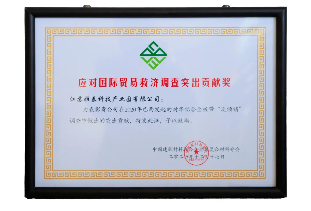2021年,受各種不可抗力因素影響,國(guó)際市場(chǎng)貿(mào)易摩擦不斷,雅泰外貿(mào)形勢(shì)略為嚴(yán)峻,但雅泰通過(guò)強(qiáng)大的國(guó)家背書(shū),尋求各方支持幫助、積極應(yīng)對(duì),成功打贏反傾銷(xiāo)一案,大會(huì)特別頒發(fā) “應(yīng)對(duì)國(guó)際貿(mào)易救濟(jì)調(diào)查突出貢獻(xiàn)獎(jiǎng)” 。
