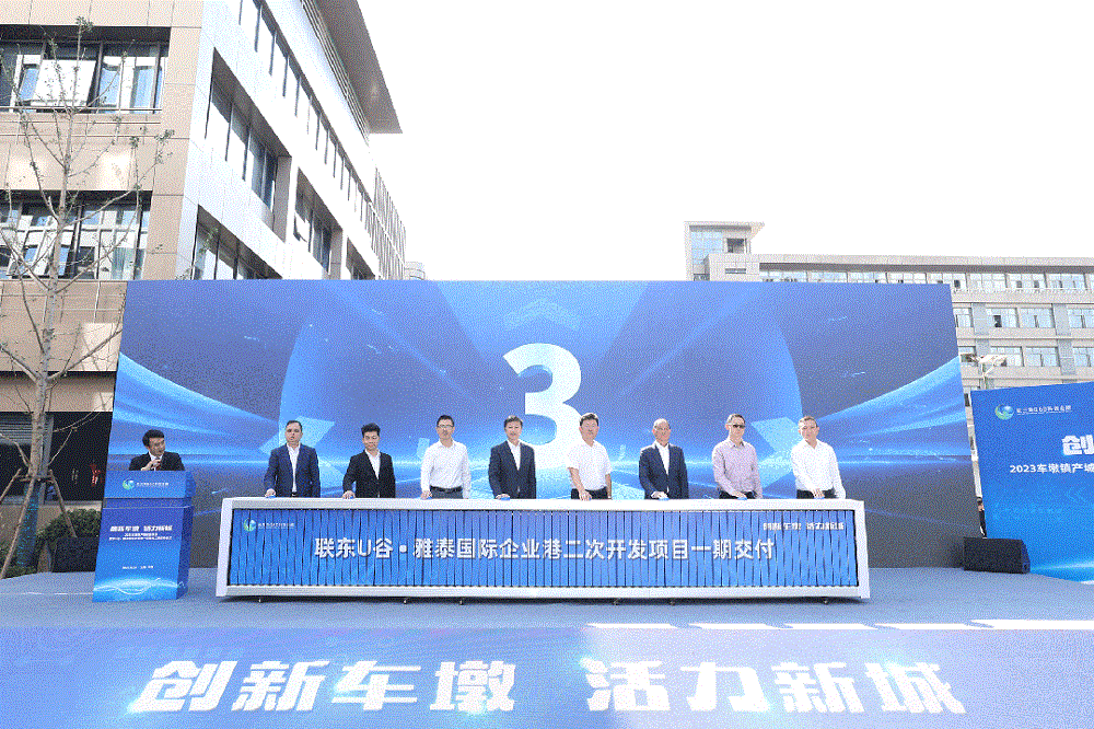 儀式最后,在熱烈的掌聲中,車墩鎮(zhèn)黨委書記高國相及區(qū)鎮(zhèn)相關領導與雅泰集團陳康富董事長、聯(lián)東U谷副總裁段朝暉一起,為車墩鎮(zhèn)產(chǎn)城融合項目聯(lián)東U谷·雅泰國際企業(yè)港二期工程合力按下了莊重的啟動鍵。